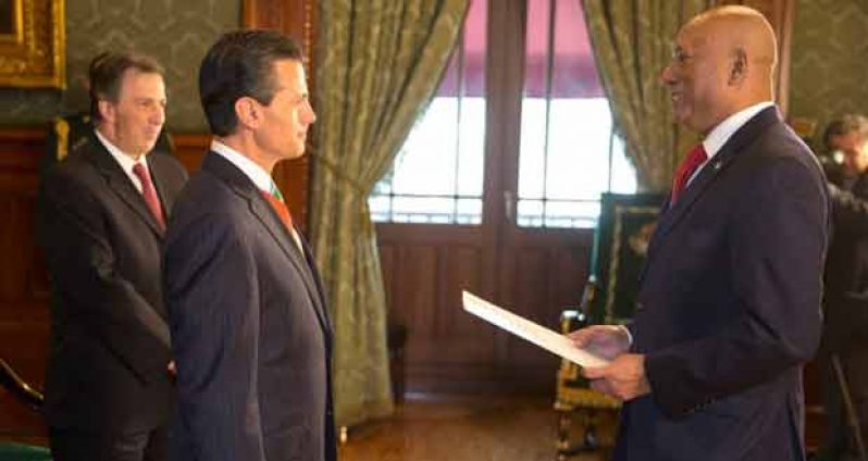 A PRESS statement from the Ministry of Foreign Affairs has said that His Excellency Bayney Karran, Guyana’s Ambassador to the United States, has been accredited Guyana’s Ambassador to Mexico on a non-resident basis.The President of Mexico, Mr. Enrique Pena Nieto, accepted Ambassador Karran’s credentials at the Presidential Palace in Mexico City on February 14, 2014, and expressed the wish that the new diplomatic appointment would serve to strengthen already good relations existing between Guyana and Mexico.