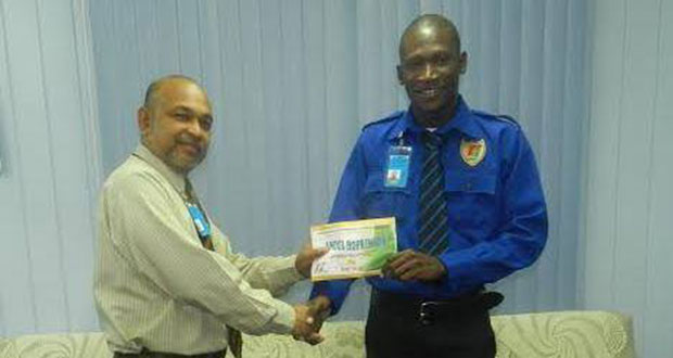 ANDEL Hopkinson, an Aviation Security Officer (ASO), was declared the winner of the Cheddi Jagan International Airport Corporation (CJIAC) March staff lottery fund.On April 20, 2016, he received his $51,000 from Deputy Chief Executive Officer Andre Kellman.