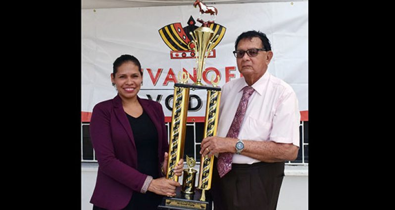 Yesterday, Chairman of the Police Complaints Authority and president of the KMTC, Justice Cecil Kennard received a cheque for an undisclosed amount as well as the first place trophy for the winner of the Class `D and Lower event from Demerara Distillers Limited’s Wines and Spirits Brand Manager Maria Munroe, at his Brickdam office.