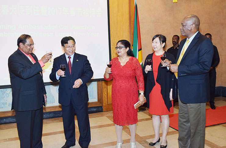 Newly-appointed Chinese Ambassador to Guyana Cui Juianchun, on Wednesday toasted to a renewed friendship with acting President Moses Nagamootoo, along with other Government officials at a welcoming reception held at the Chinese Embassy which also simultaneously ushered in the Chinese Lunar New Year.Ambassador Juianchun, who came to Guyana three weeks ago, expressed gratitude for the overwhelming welcome and hospitality he has received from the Government, the Chinese community and the people of Guyana.
