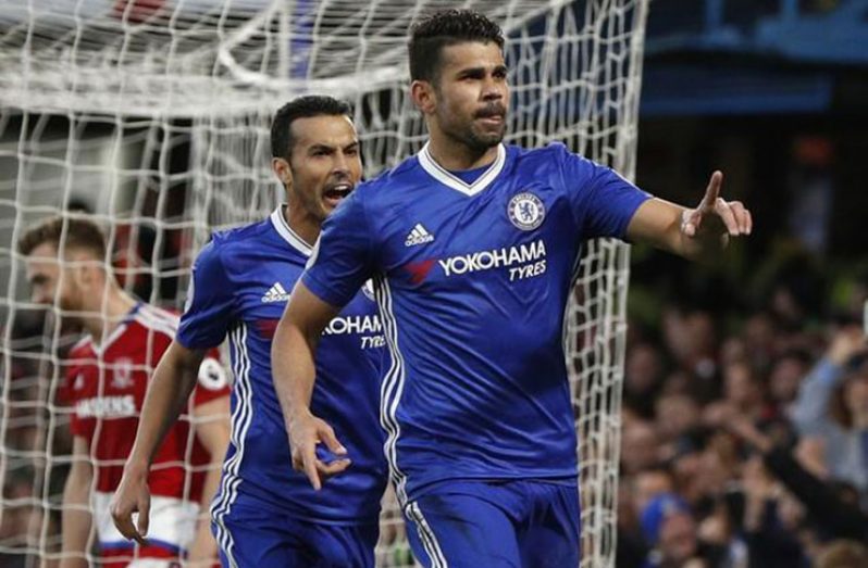 LONDON, England (Reuters) – Chelsea moved within three points of clinching the Premier League title with a 3-0 victory that condemned Middlesbrough to relegation yesterday after goals from Spaniards Diego Costa and Marcos Alonso plus a tap-in by Nemanja Matic.