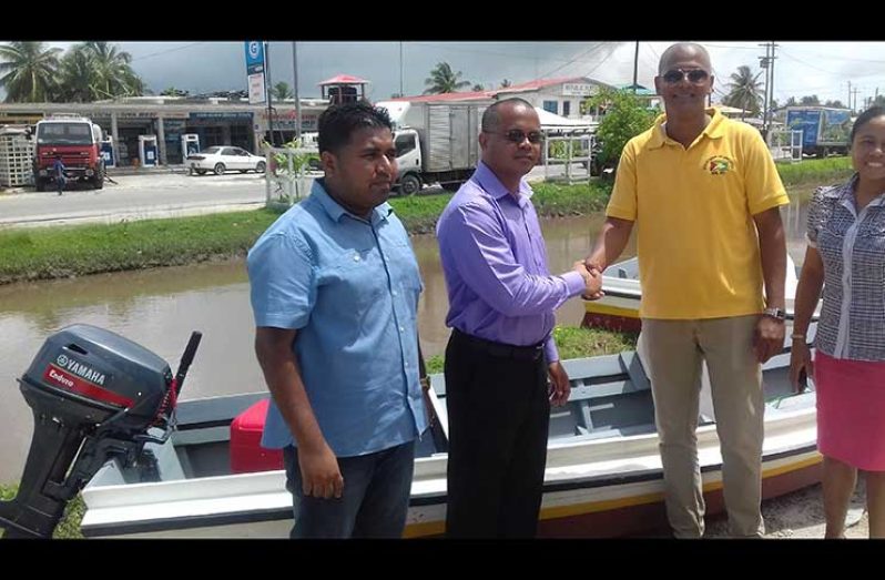 REO of Region Two, Derrick Persaud, handing of one of five boats and engines to District Education Officer, Deodath Singh, in the presence of the Regional Engineer, Latchman Singh