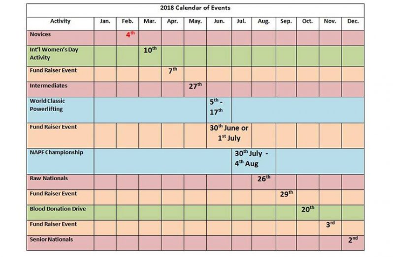JUST days after kicking off the New Year with their Novices/Juniors Championships, the Guyana Amateur Powerlifting Federation (GAPLF) has unveiled its calendar of activities for 2018.