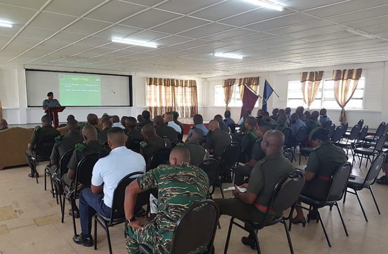 Senior and Junior GDF ranks being addressed at the Jaguar Lecture Hall, Base Camp Stephenson Timehri