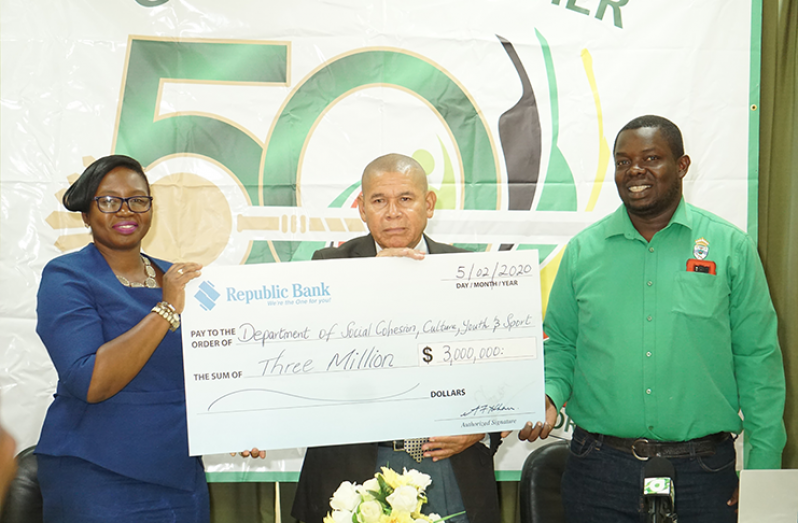 AS Guyana gears up to celebrate its 50th Republic Anniversary, Republic Bank Guyana Limited (RBL) on Wednesday morning presented the Ministry of Social Cohesion, Culture, Youth and Sport with a cheque for $3M to sponsor one of the most highly anticipated events of the Mashramani season, Pan-O-Rama.