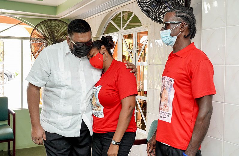 PRESIDENT IRFAAN ALI, on Sunday, joined the family and friends of the late Anthony Cort at Sandy’s Funeral Parlour to bid farewell to the 10-year-old whose life was tragically cut short on March 11. Cort was shot dead by bandits during a home invasion in ‘C’ field Sophia, Greater Georgetown. President Ali comforted Cort’s mother, Denise McPherson, and other relatives who gathered at the funeral home to say their final goodbyes. The President, in his brief remarks, said this is a time for all Guyanese to unite in prayers in support of the grieving family. “As a nation, let us come together and pray for this family who tragically lost their loved one and for all of the other families who have also lost loved ones in this pandemic,” the Head-of-State was quoting as saying by the Office of the President.