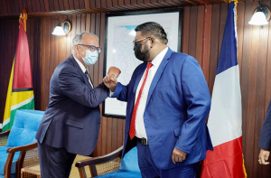 PRESIDENT, Dr. Irfaan Ali, on Friday morning, met with Ambassador of the French Republic to Guyana, Antoine Joly, and a group of French army officials, at State House.