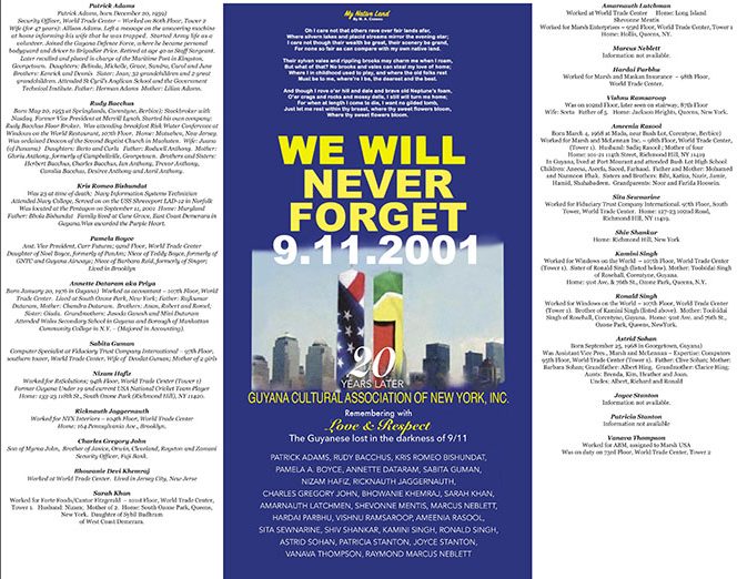 The Sunday immediately after the tragedy, I was present at a memorial gathering at a private home where fellow Guyanese sang hymns and said prayers for those who were killed in the terrorist attacks on America. Members of the gathering were all still in a state of semi-shock and trying to make sense of what had happened and the deaths of Guyanese, who were innocent victims. A few days later, I attended another memorial service which was organised by the Guyana Consulate in New York, and which was attended by hundreds of Guyanese mourners and their American friends.