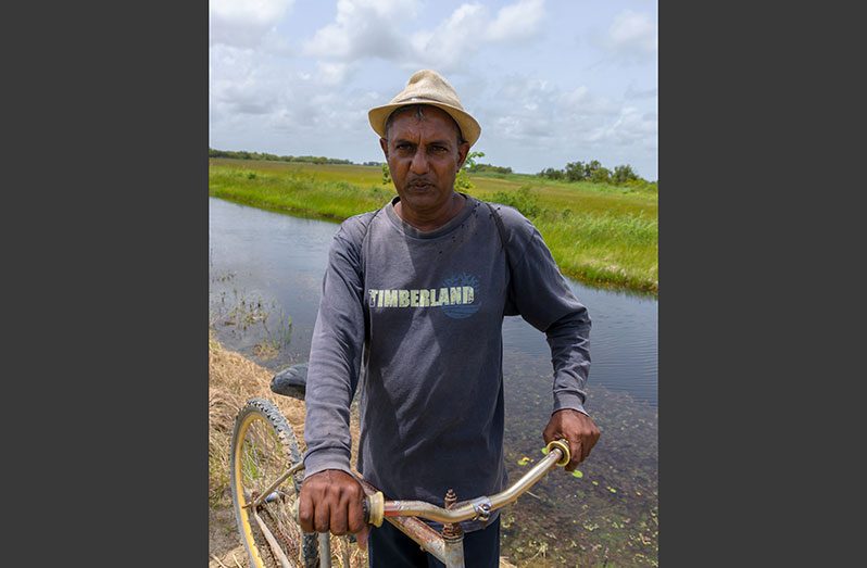Parsram Khelawan is 86 years old and a farmer, who was observed walking and spraying the tall grass by the koker which is used as a landing for boats and a loading area for produce.
