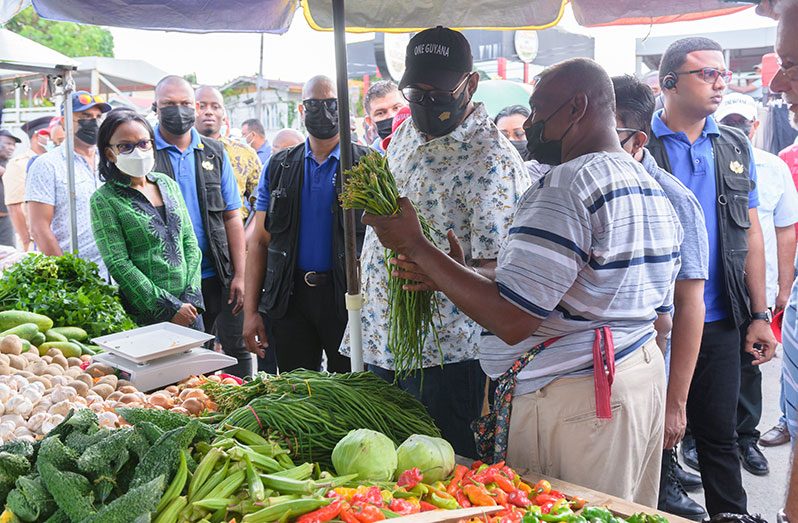 President Dr. Irfaan Ali and other government officials interact with a vendor at the Leonora Market (Delano Williams photo)