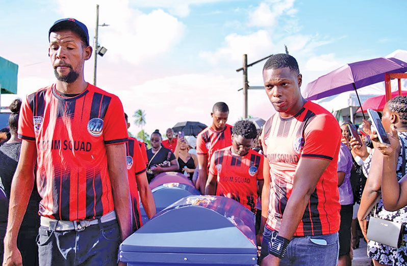 Members of Mocha’s football team, Riddim Squad, carry the caskets containing the remains of the siblings