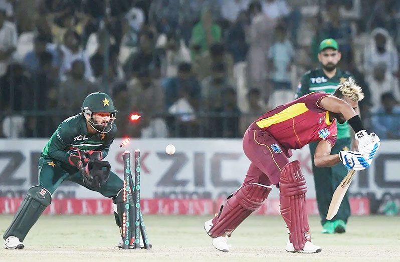 West Indies’ innings began disastrously, with Shaheen Afridi removing their best batter Shai Hope in the first over, trapping him on his crease as he spooned a catch to cover.