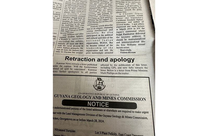 The newspaper wrote: “Kaieteur News retracts a letter published under the caption, ‘Will the businessmen behind oil spill be sanctioned’. Kaieteur News further apologised to all parties affected by the publication of this letter.”