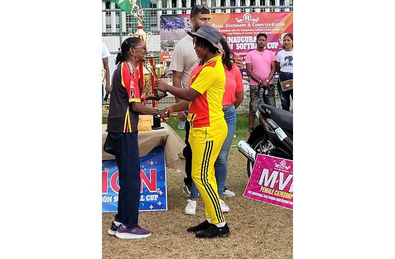 Linda Stephen of Rising Stars, the lone centurion (101 not out on the opening day), took home the Most Valuable Player (MVP) prize of the category – one living room suite and a bicycle, compliments of the Ministry of Culture, Youth and Sport while her cousin Ackeela Stephen was named Player of the final and was awarded with a trophy.