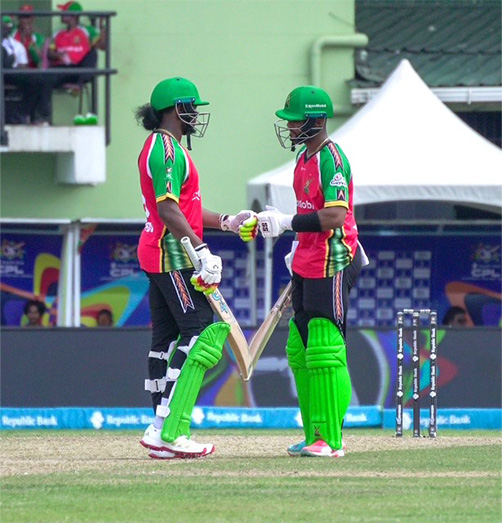 Quinten Sampson and West Indies batter Shai Hope celebrate his pugnacious half-century for the Guyana Amazon Warriors at Providence