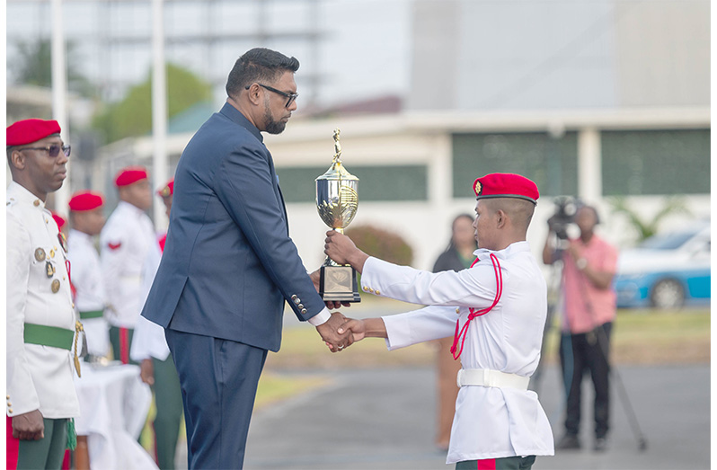 President Dr. Irfaan Ali presents an award to one of the outstanding graduates of the Standard Officers Course #56 during Wednesday’s commissioning parade at Base Camp Ayanganna (Delano Williams photo)