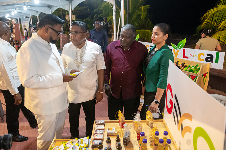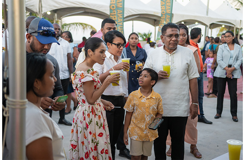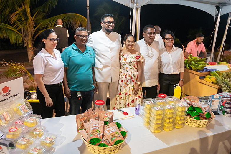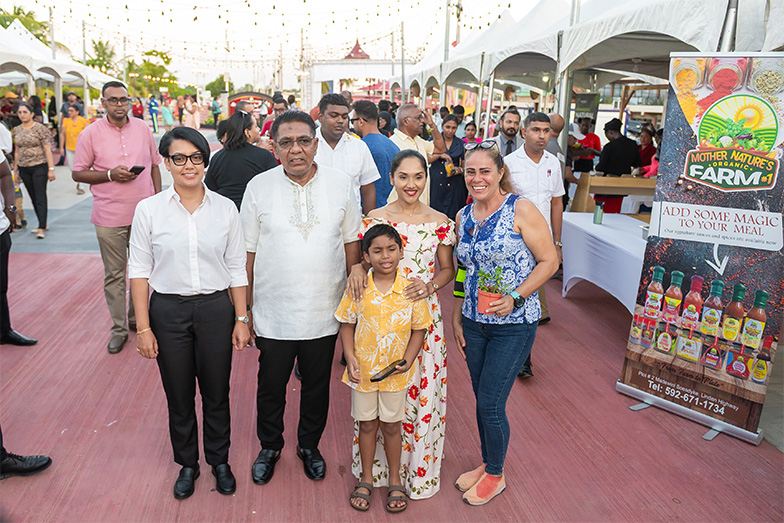 President Dr. Mohamed Irfaan Ali, the First Lady, Mrs. Arya Ali, their eldest son, Zayd, Minister of Tourism and Culture, Susan Rodrigues, Minister of Agriculture, Zulfikar Mustapha, and others, during a walkabout interacted with those who have stalls.