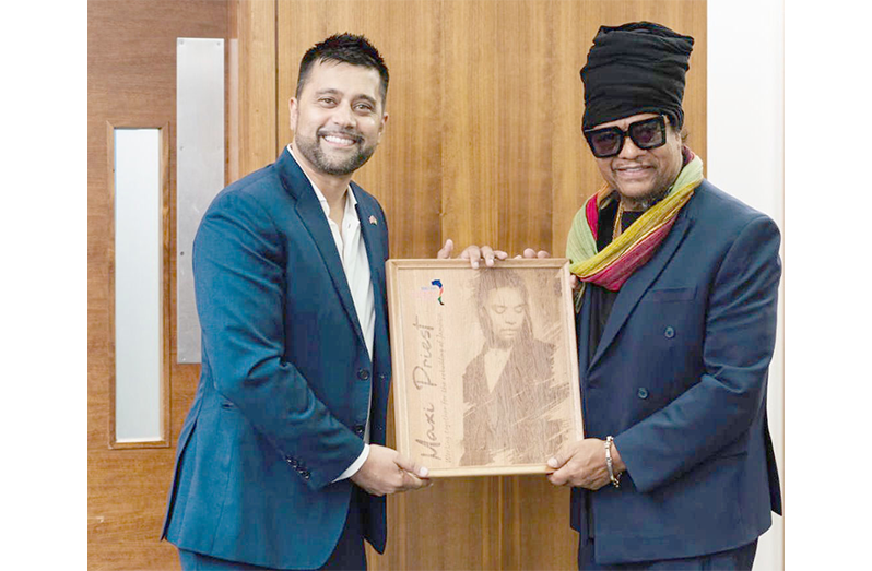 Maxi Priest and Faizal Khan with a signed Maxi Priest greenheart wooden engraved plaque created by Branderz Guyana