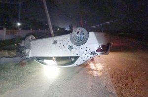 The accident occurred at Number 41 Village turn. As the car came around the bend, a donkey suddenly ran across the road. In an attempt to avoid hitting the animal, the driver swerved, collided with a lantern post, and the vehicle toppled over, landing turtle-up.